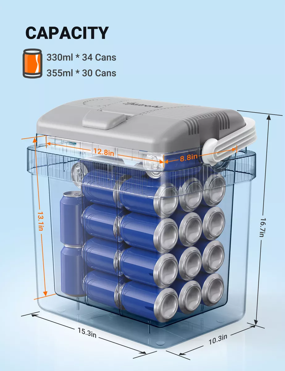 2. 24 LITROS DE GRAN CAPACIDAD: ¡Almacén! (30) latas de 12 onzas! Las dimensiones internas son 12.8 x 8.8 x 13.1 inch; El divisor extraíble hace que los artículos pequeños como bebidas, cervezas, vinos, alimentos o frutas sean fáciles de separar.