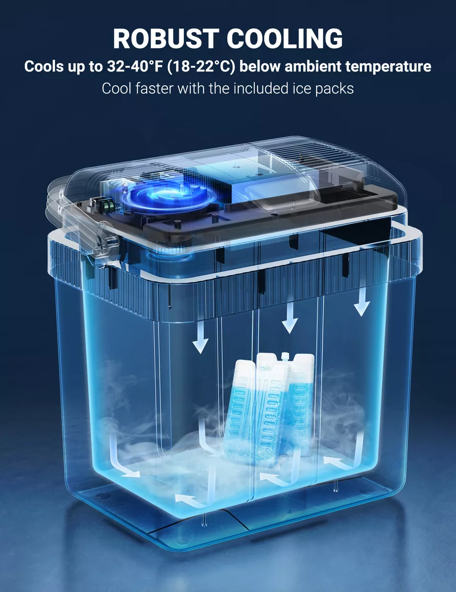 1. ENFRIAMIENTO ROBUSTO: El enfriador eléctrico enfría hasta 32-40 F (18-22 C) por debajo de la temperatura ambiente