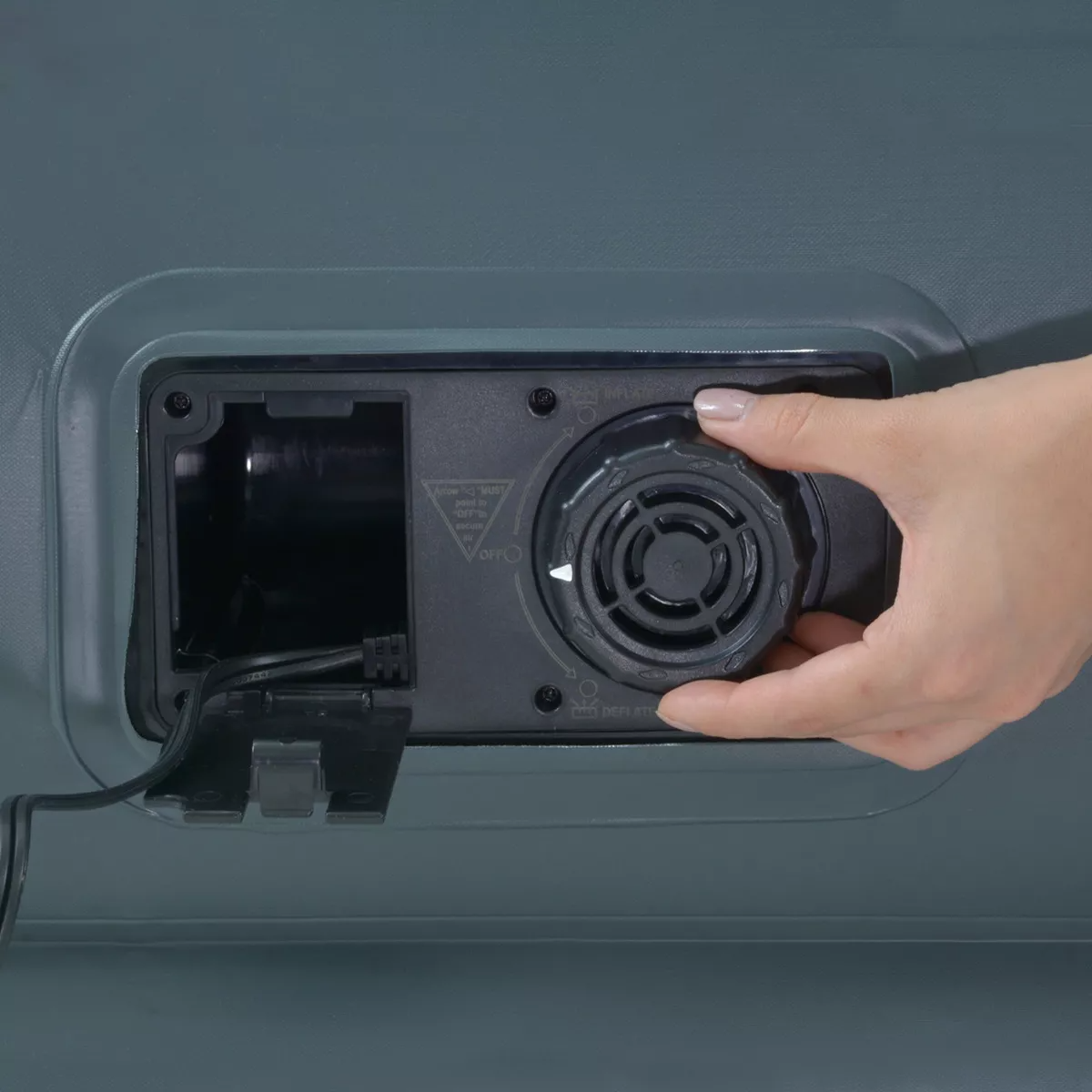 • VÁLVULA DE INFLADO MANUAL: En caso de que no puedas inflar el colchón por medio de la energía eléctrica, el colchón integra una válvula 2 en 1 para inflarlo de manera manual y un tapón de liberación para expulsar todo el aire cuando dejes de utilizarlo.