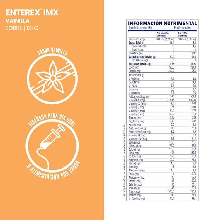 Enterex IMX sobre 131g, sabor Vainilla LatteFórmula para Alimentación Enteral Especializada. Dieta Semi-elemental con Lactoalbúmina, Aminoácidos de Cadena Ramificada, Glutamina, Arginina, Ácidos Nucleicos, Ácidos Grasos Omega-3, Triglicéridos de Cadena Media y Antioxidantes. INGREDIENTES: Maltodextrina, Lactoalbúmina, L-Arginina, L-Glutamina, Sabores naturales y artificiales vainilla latte, Aceite de Canola,Triglicéridos de Cadena Media , Extracto de levadura, L-Valina, L-Leucina, Carragenina, L-isoleucina, Lecitina de Soya, Fosfato de Magnesio Dibásico, Cloruro de Calcio Anhidro, Sucralosa, Citrato de Potasio, Bitartrato de Colina, Acesulfame de Potasio (edulcorante), Cloruro de Sodio, Mono y Diglicéridos, Taurina, Carbonato de Calcio, L- Carnitina, DI- Alfa – Tocoferol Acetato, Gluconato Ferroso, Fosfato Tricálcico, Ácido Ascórbico, Óxido de Zinc, Biotina, Gluconato de Cobre, Piridoxina HCL, Niacinamida, Sulfato de Manganeso, Beta-Caroteno, Pantotenato D- Cálcico, Palmitato de vitamina A, Fitonadiona, Colecalciferol SD, Fluoruro de Sodio, Selenita de Sodio, Yoduro de Potasio, Riboflavina, Mononitrato de Tiamina, Cloruro de Cromo, Cianocobalamina, Ácido Fólico, Molibdato de Sodio. Contiene ingrediente de leche y soya. Información de productoEspecificaciones técnicas