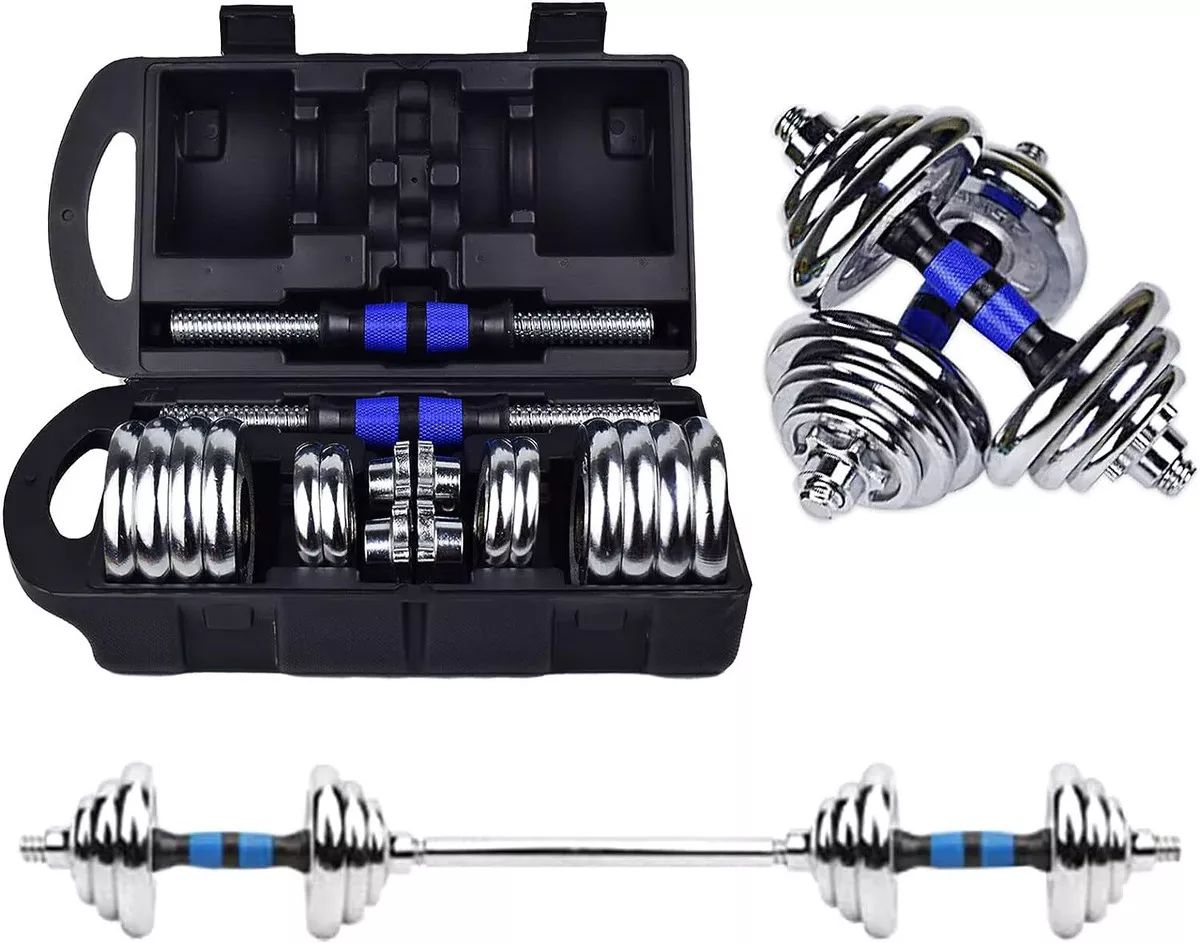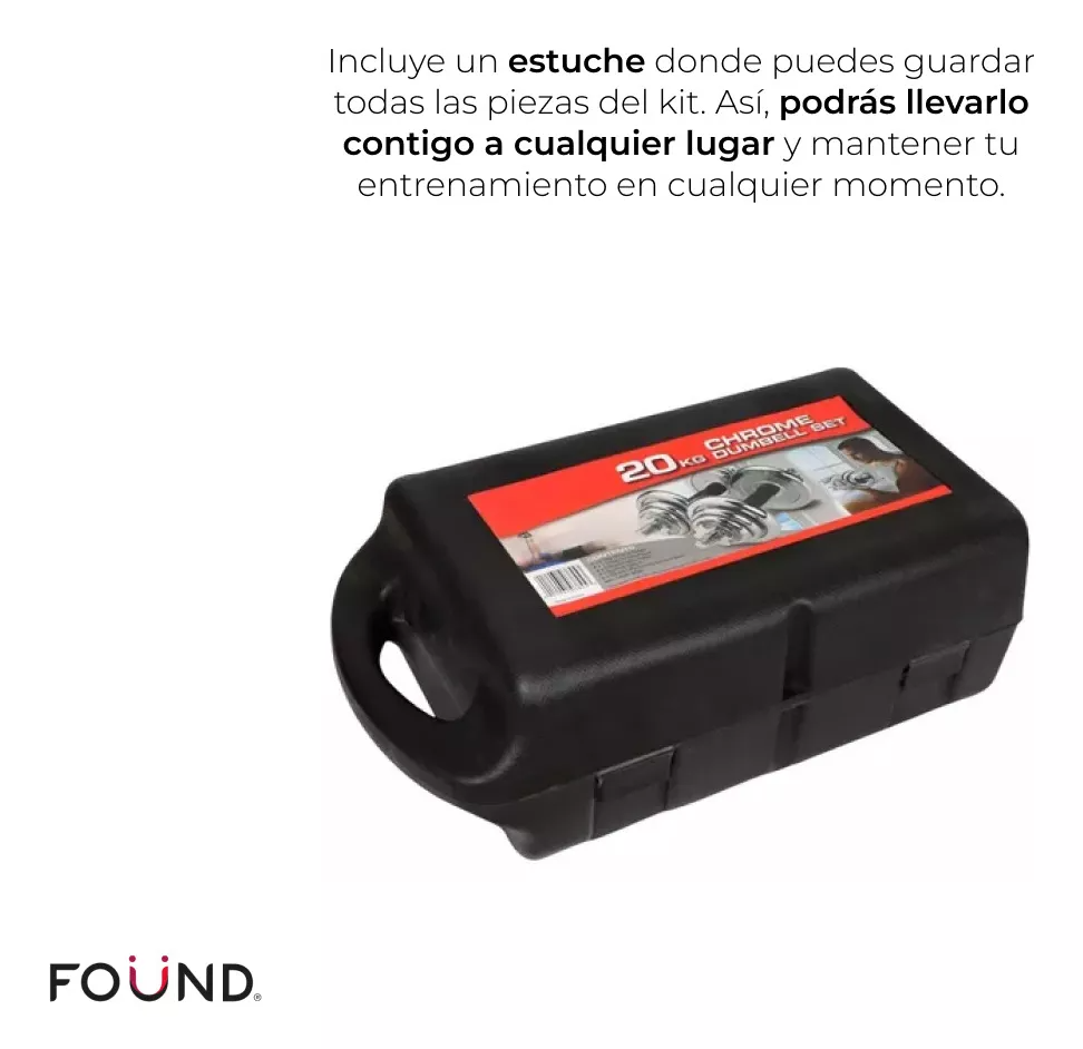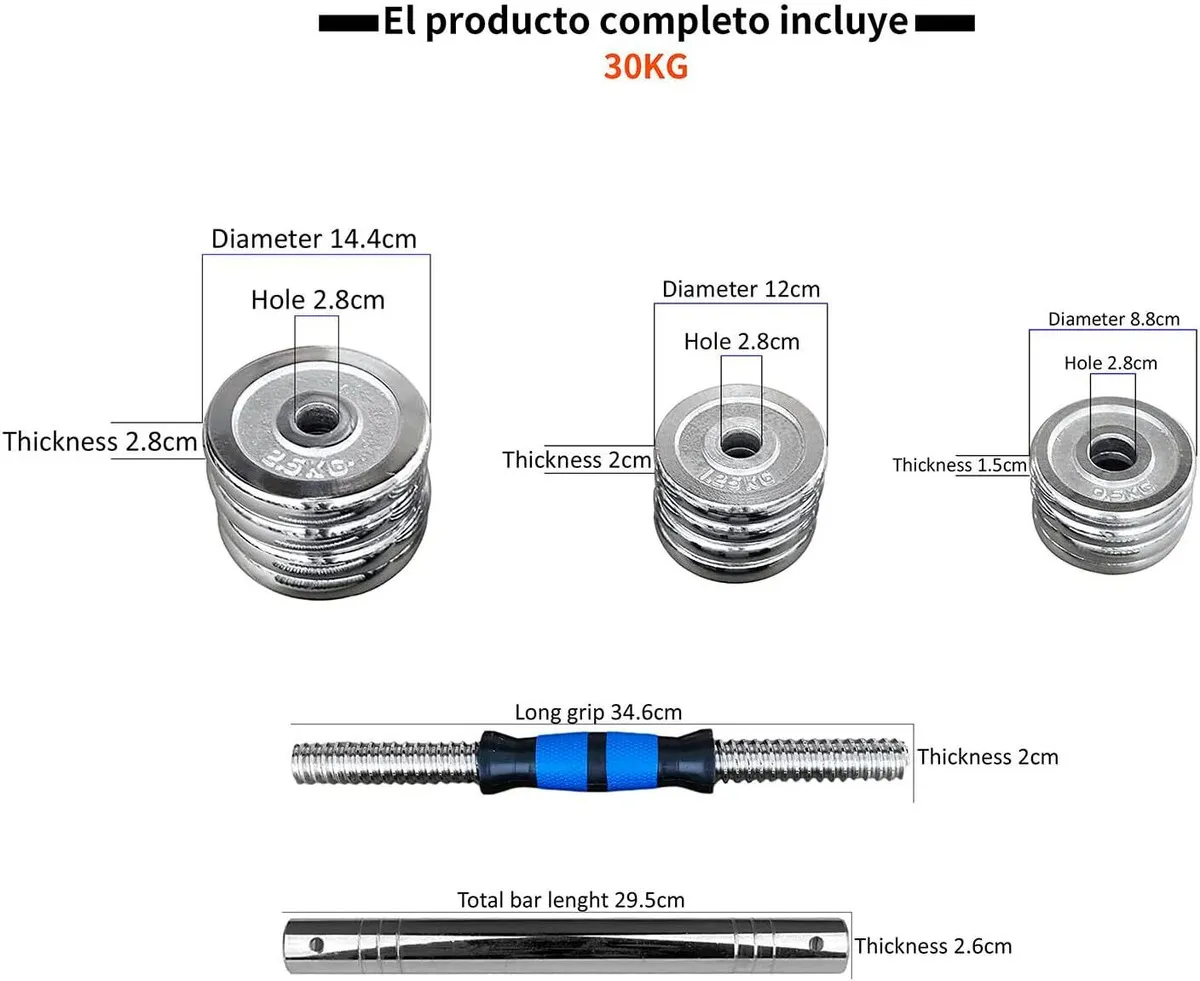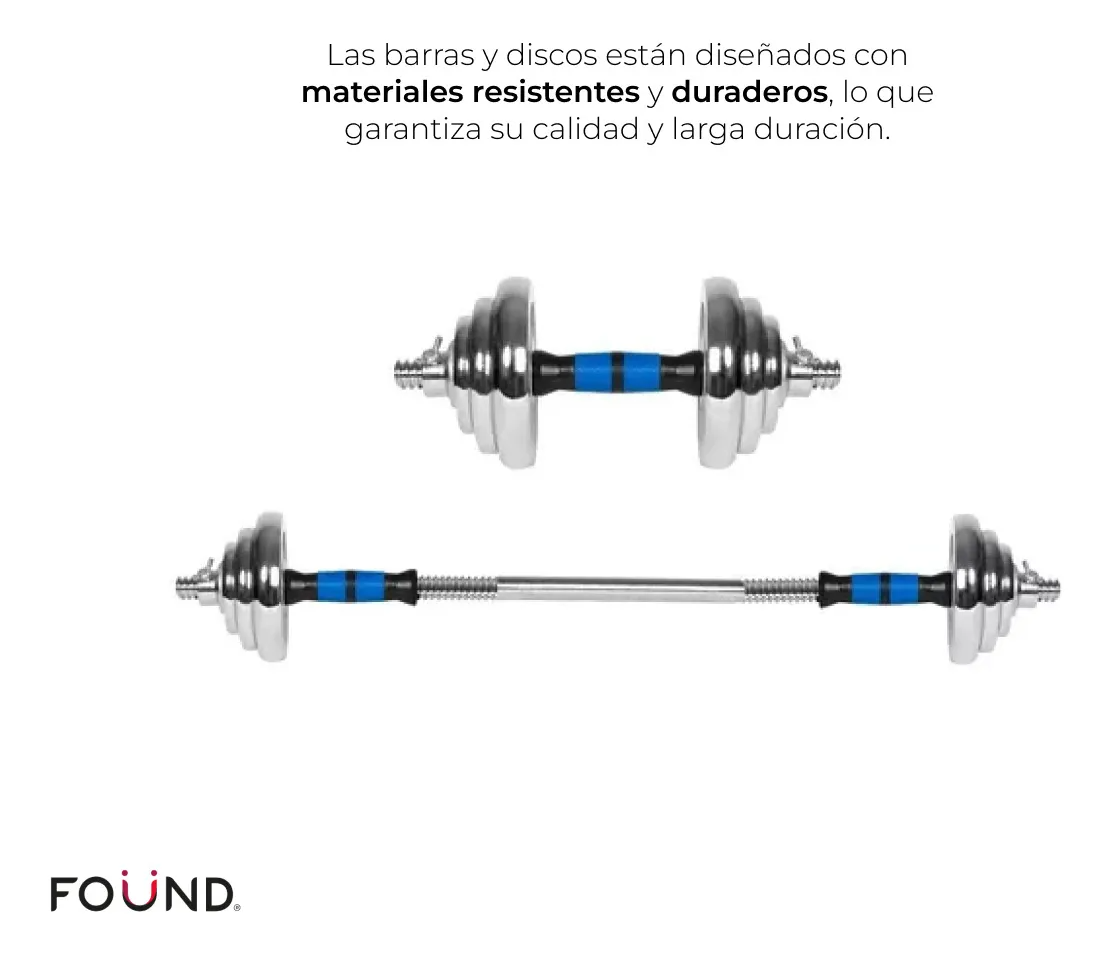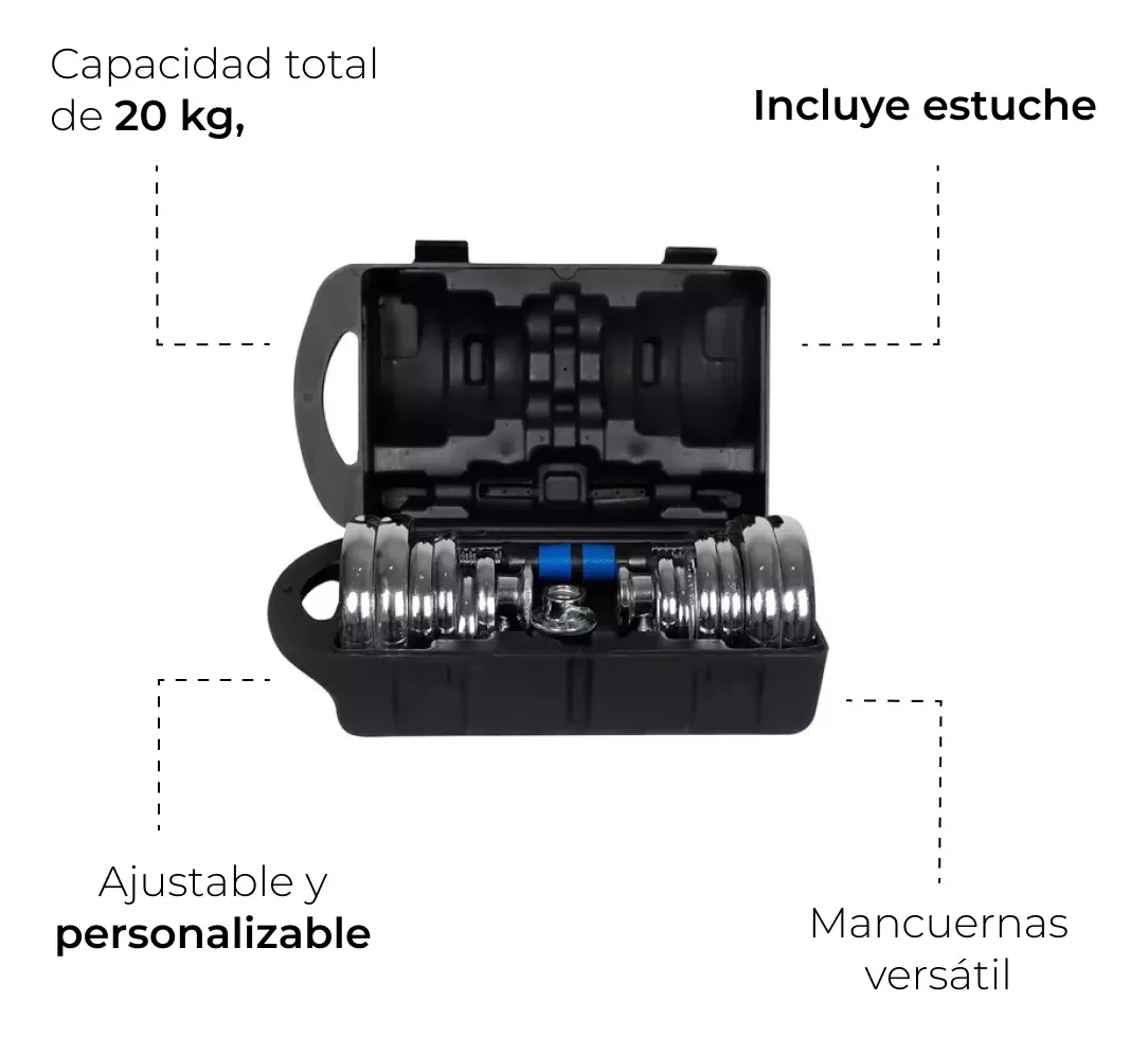 Ver todas las características DescripciónEste kit de mancuernas es ideal para ejercitarse en casa y es adecuado tanto para principiantes como para usuarios más avanzados. Con una capacidad total de 20 kg, el kit incluye 2 barras de mancuernas de 34 cm cada una y una barra de conexión para combinar ambas barras en una más larga y robusta. Se incluyen 4 tuercas de seguridad para fijar los discos durante el ejercicio. |