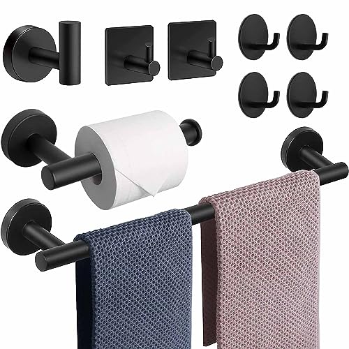 - 【Juego de Accesorios de Baño de 9 Piezas】El juego de accesorios de baño de 5 piezas incluye barra de toalla negra mate de 41cm, soporte de papel higiénico, 7 ganchos y accesorios de montaje completos, combinación perfecta para remodelar baño, ducha al aire libre y armario de baño remodelado, armario de cocina, sala de estar y decoración. Todos los accesorios de baño que necesitas con una fácil compra.