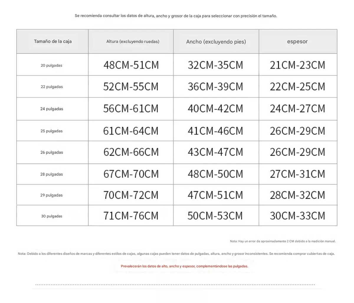 Tenemos 6 tamaños diferentes disponibles, son 20",22",24", 26", 28", 30". Antes de elegir una funda para tu maleta, es muy importante medir cuidadosa y correctamente la altura (sin tener en cuenta las llantas), la longitud y el ancho de la maleta. Este modelo no se hinchará, por lo que es importante verificar las medidas correctas.