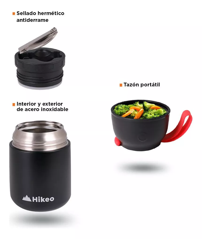 Te encantará que tiene tamaño compacto para cargar con él a donde sea, pero le cabe más de medio litro de sopa. Cuenta con un sello hermético interior, una tapa que sirve como tazón y una cuchara plegable para disfrutar tu comida en el momento que quieras.