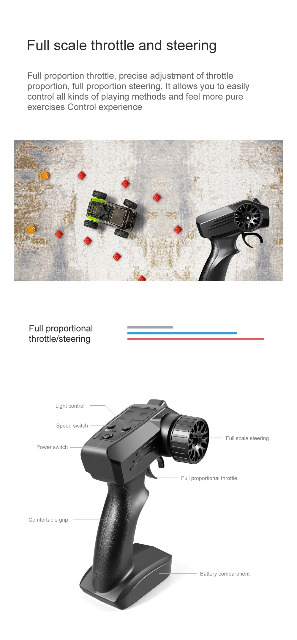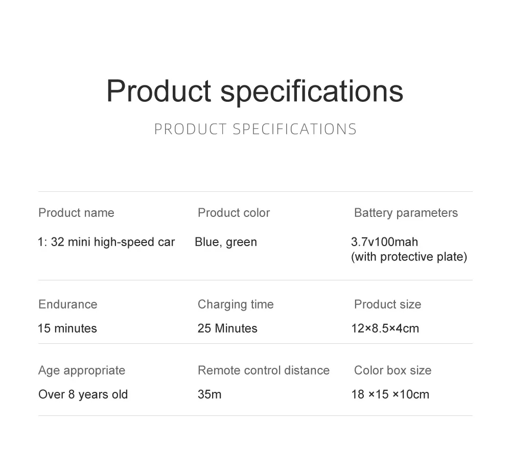 Descripción del producto: Mini vehículo de Control remoto para montañismo, vehículo todoterreno RC 4WD, vehículo de deriva, coche de juguete para niños 1:32 Característica: 1.Tipo todoterreno, adecuado para múltiples lugares, 1:32 compacto y portátil, se puede jugar en cualquier momento y en cualquier lugar. 2.Carga USB de 3,2 V.Equipado con protección de carga, más rápida y cómoda. 3.Aproximadamente 30 metros de distancia de control remoto Atributos del producto: Tipo: Control remoto inalámbrico, carga Público aplicable: ilimitado, niñas, niños. Características especiales: la carcasa del automóvil se ilumina y gira hacia adelante, hacia atrás, hacia la izquierda y hacia la derecha. Material del juguete: plástico Desarrollo de habilidades: desarrollo intelectual, potencia práctica y cerebral, agarre, sentidos, coordinación ojo-mano, desarrollo de otras habilidades, juguetes interactivos, audición, comunicación entre padres e hijos, cultivo de intereses. Número de producto: 801/802 Método de control remoto: manija Colores: naranja S801, verde S802, azul 658 Escala: 1:32 Producto con peso del embalaje: 300 gramos Especificaciones del producto: 11*8,6*5,9 cm Especificación de la caja de color: 18,5 * 10 * 15,5 cm Batería: batería de litio de 3,7 V 100 MAH con doble protección Cargando; 25 minutos Duración de la batería: 18 minutos Distancia de control remoto: aproximadamente 30M El paquete incluye: 1 * caja de embalaje 1 * Instrucciones 1 * coche con control remoto 1 * control remoto 1 * cable de carga 1 * Accesorios 1 * herramientas de mantenimiento |